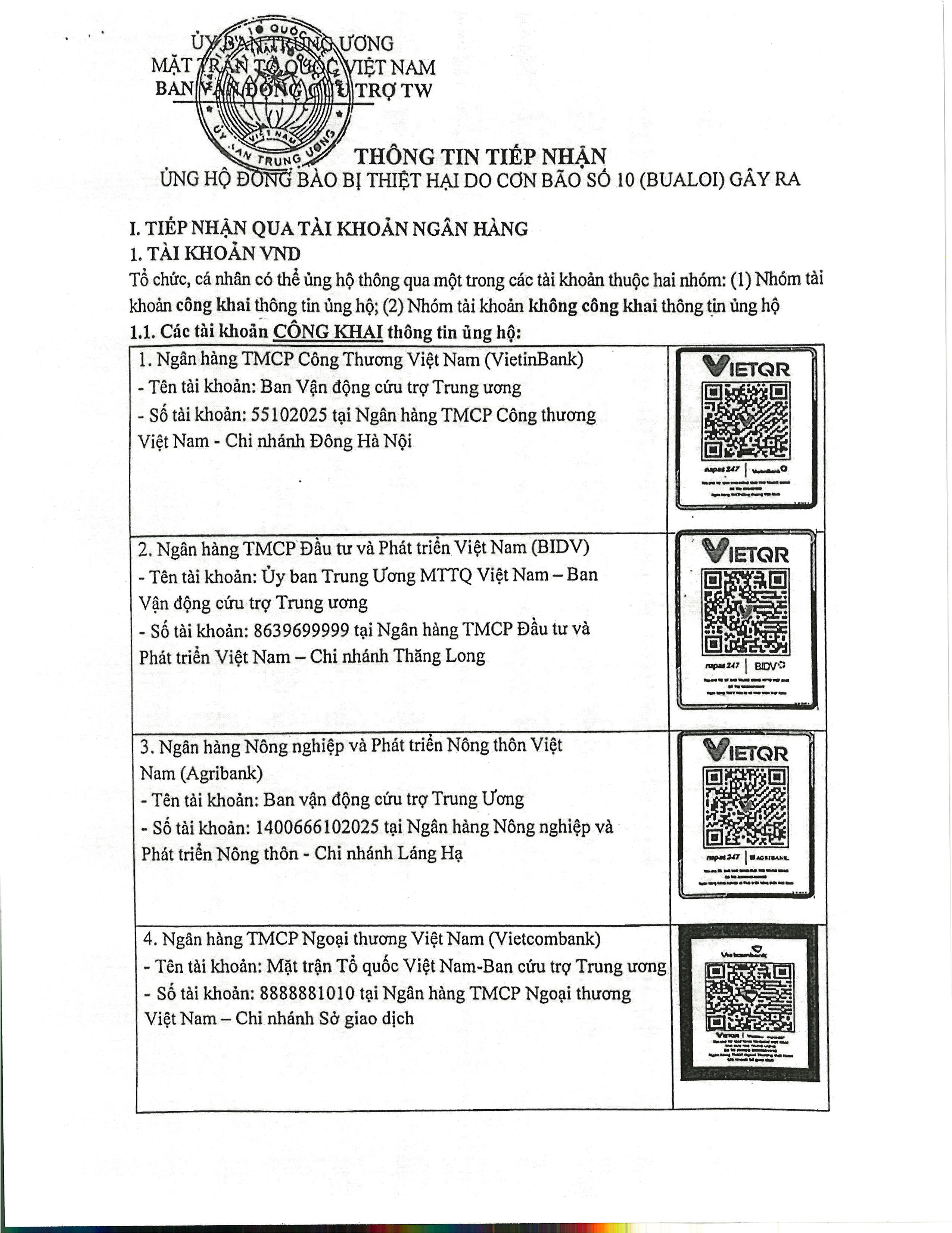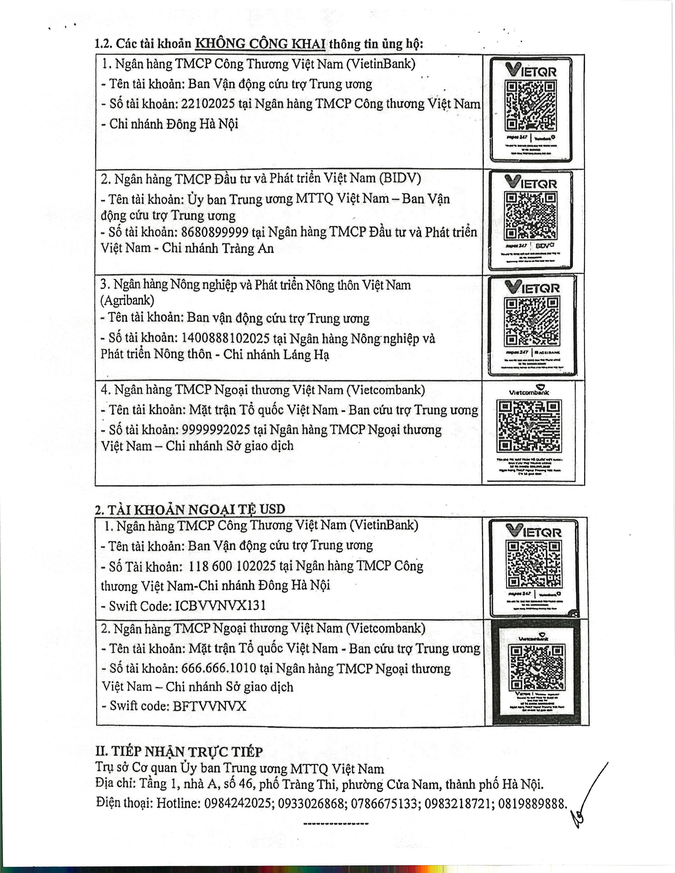 Mọi ủng hộ, hỗ trợ bằng tinh thần và vật chất xin chuyển về Ban Cứu trợ Trung ương, Ủy ban Trung ương Mặt trận Tổ quốc Việt Nam qua các hình thức sau: